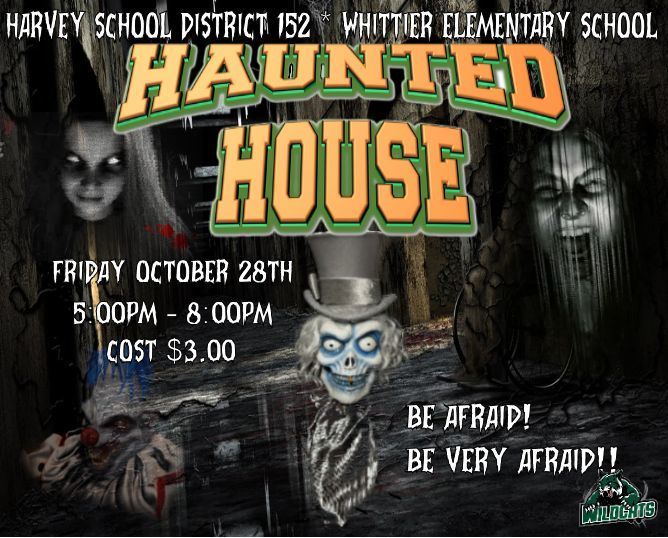 FRIDAY OCTOBER 28 WHITTIER ELEMENTARY SCHOOL HAUNTED HOUSE! 5-8PM $3 BE AFRAID, BE VERY AFRAID!!